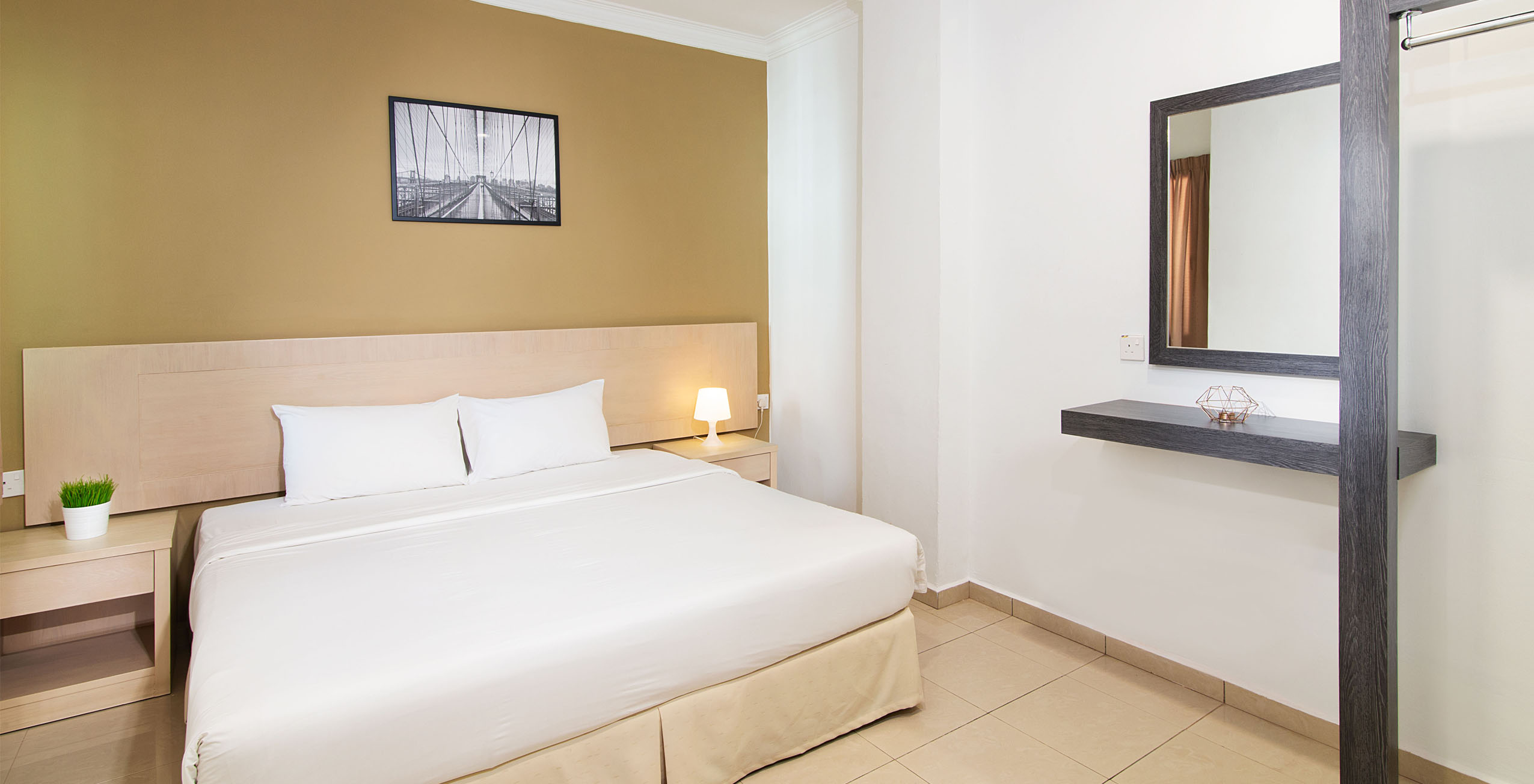 - Unit apartemen yang luas dengan ruang tamu, dapur kecil, 2 kamar tidur dan 2 kamar mandi